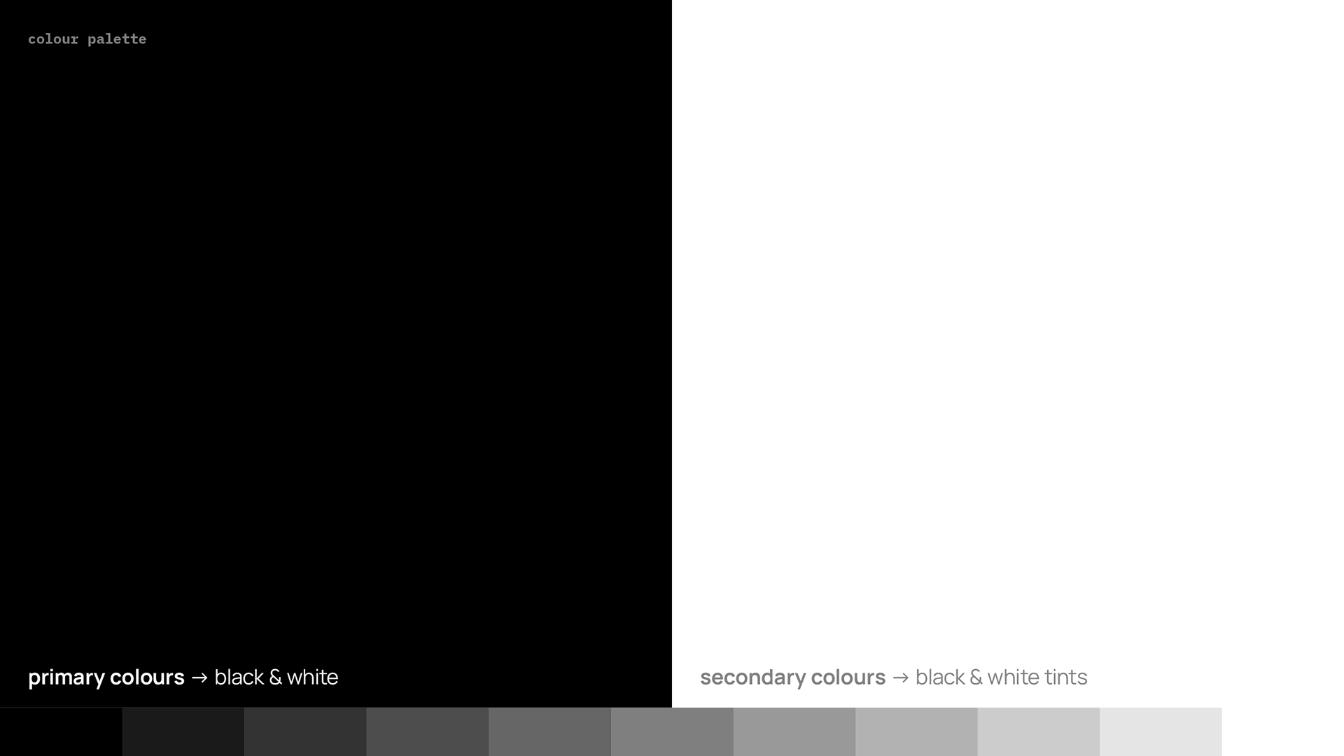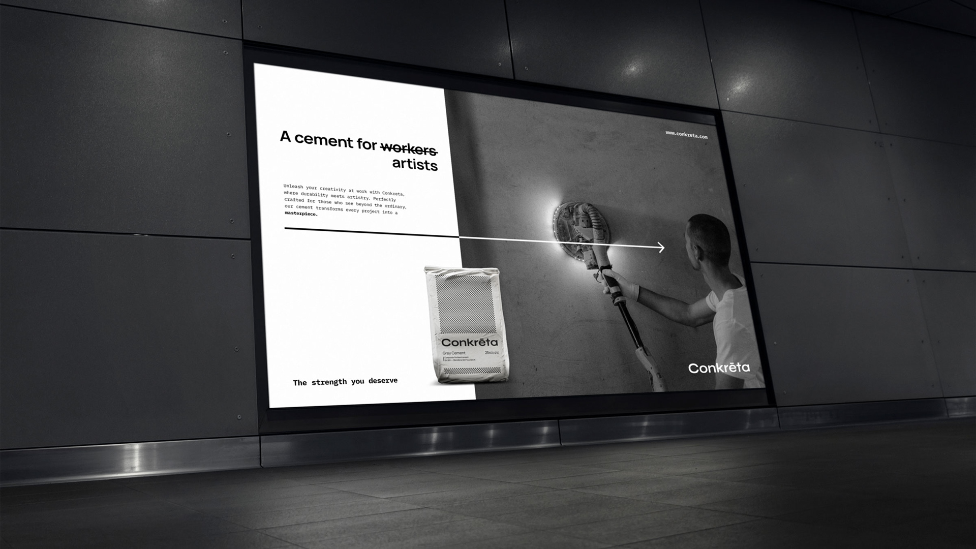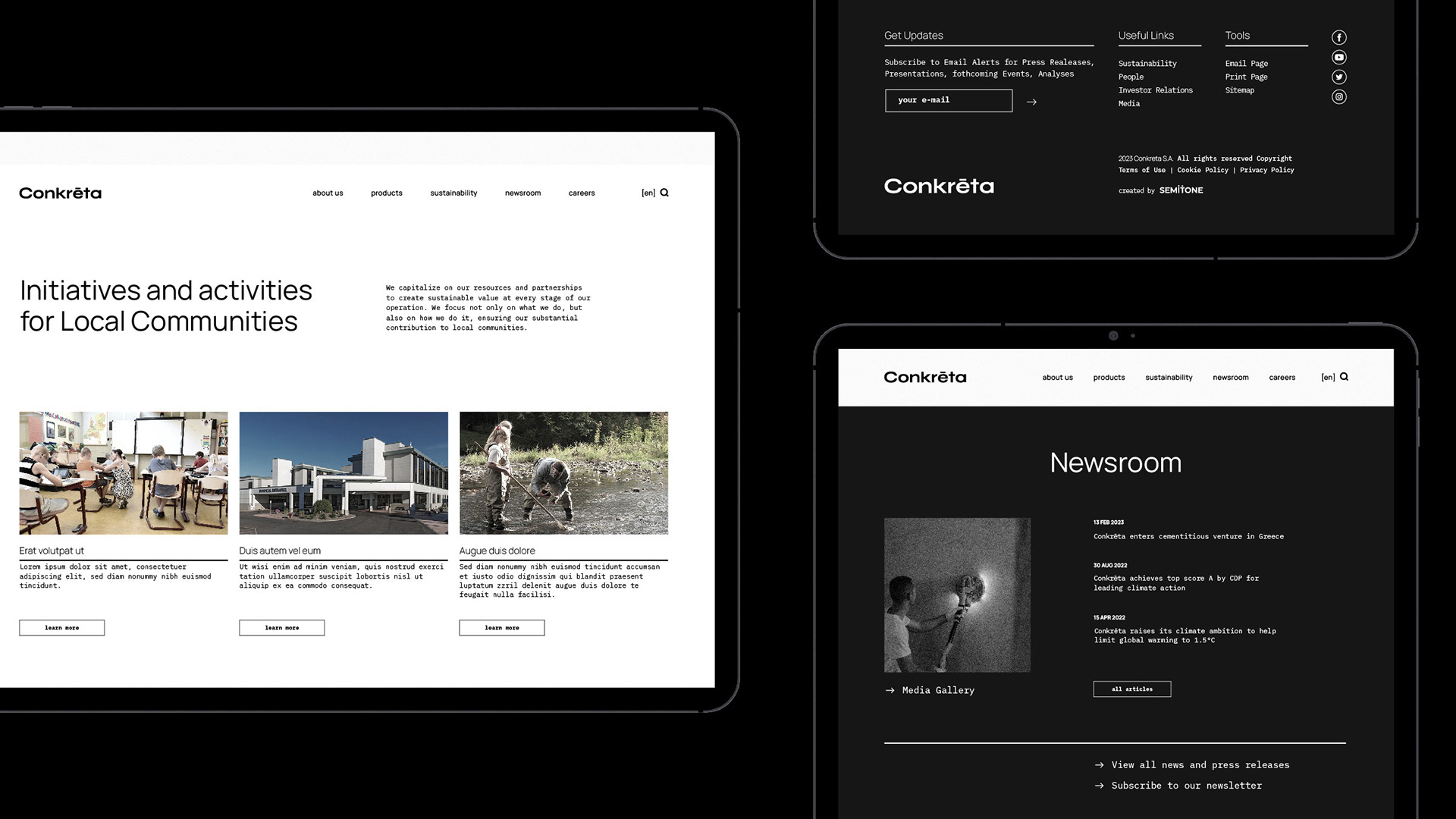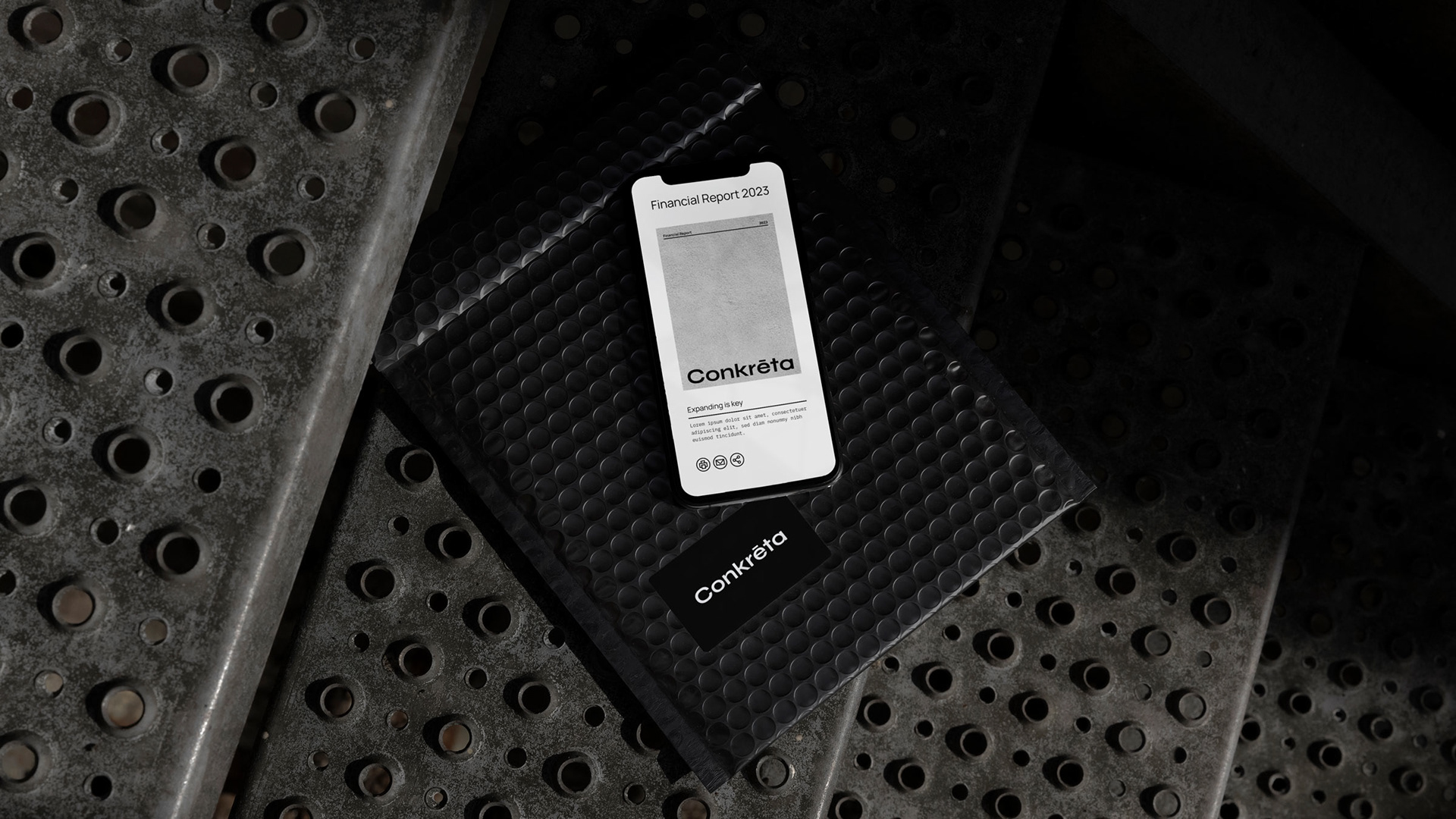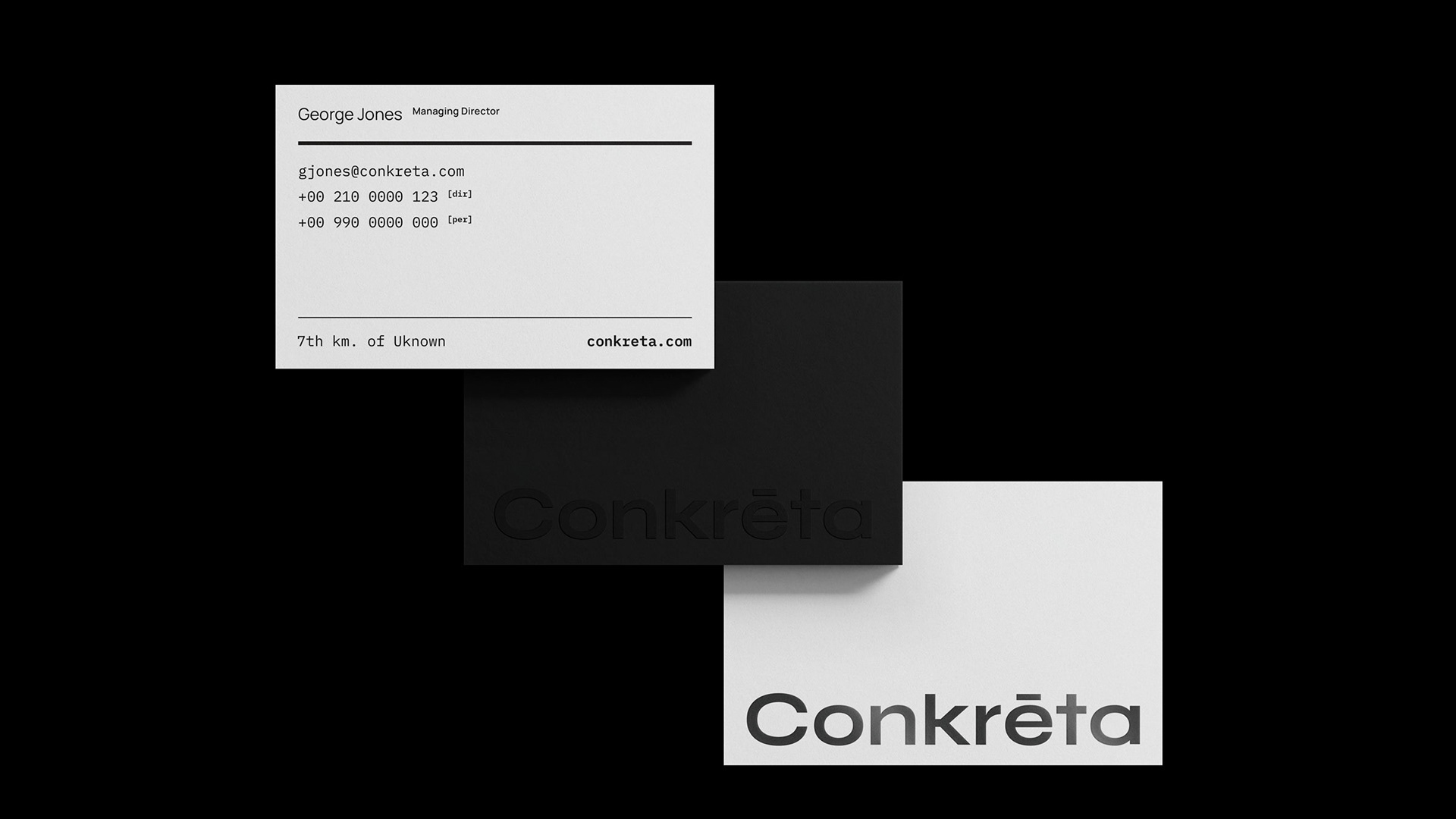 Concrete is a durable and reliable material that acts as the foundation of most modern buildings. In order to convey that, we chose black and white as the primary color palette and tones of black as secondary. This represents concrete both visually and conceptually. The color palette is dominant throughout every visual element of the identity, from flat graphics to photographs. That level of consistency describes concrete perfectly, while also reinforcing a solid visual identity.