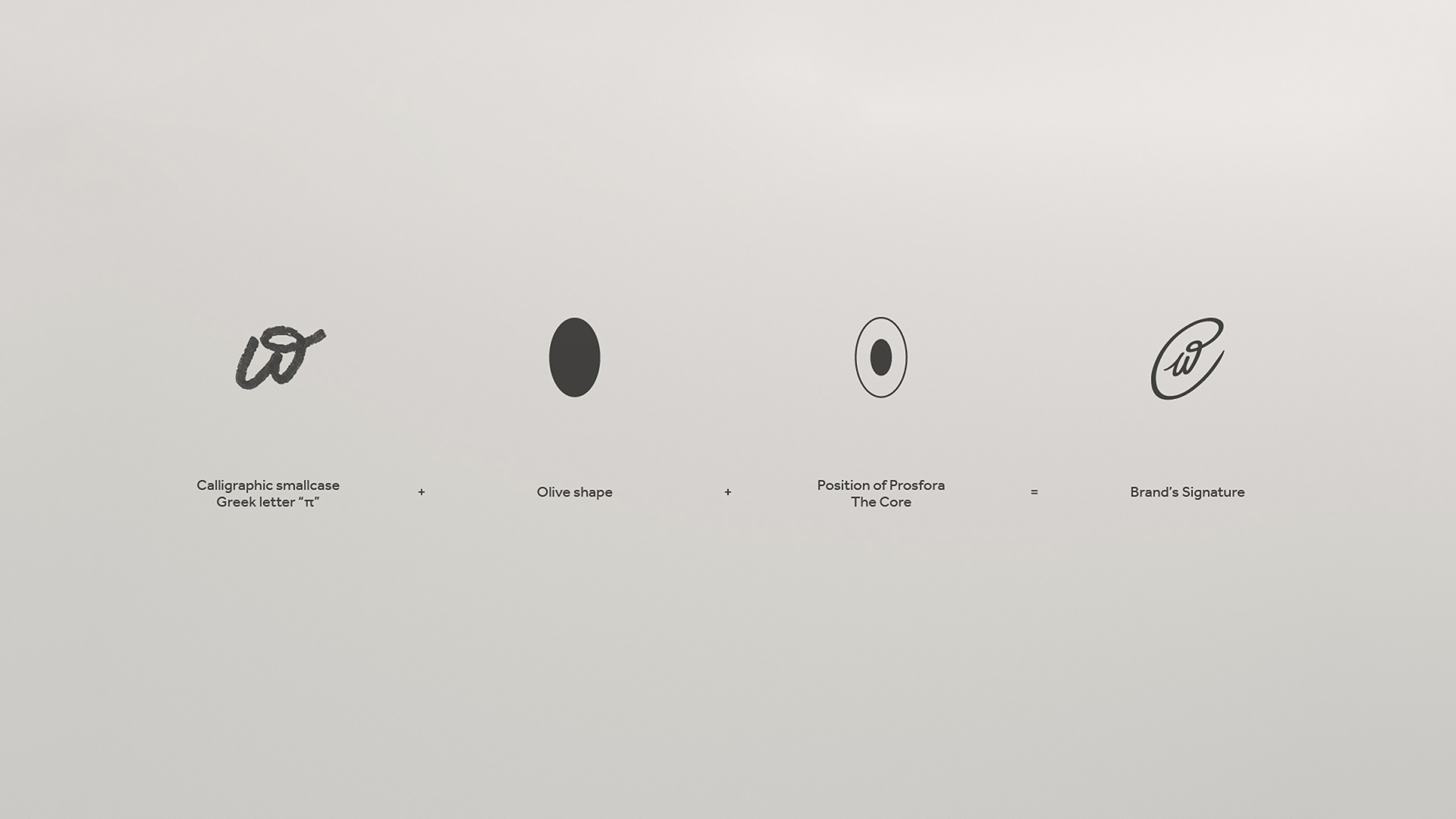 Austere black and white color palette in combination with the clean use of typography, brings forward the absolute purity of the product, while achieving a modern and elegant design. The signature of the brand derives from the greek letter "π" written in calligraphy, placed in the core of a olive shape to resemble the core value of the brand's prosfora-offer of premium quality products.